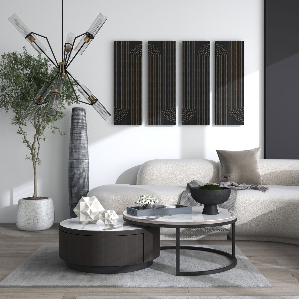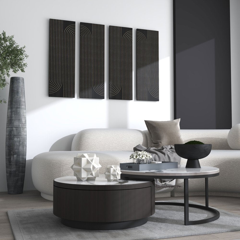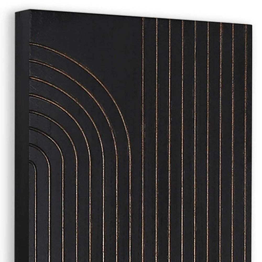 Adorn your walls with this set of two contemporary black wood hanging dimensional sculptures, each measuring 36-inch x 12-inch. Crafted from wood through machine-made manufacturing, these rectangular pieces feature other geometric shapes suitable for both horizontal and vertical orientation. Add a touch of style to your living space with this chic wall decor that effortlessly blends in with your existing furniture, making it a perfect decorative accessory. 36-inch H x 12-inch W x 1.5-inch D