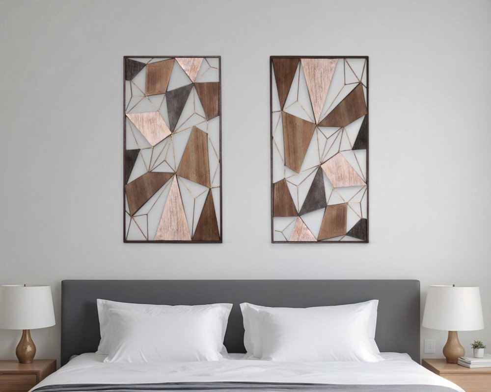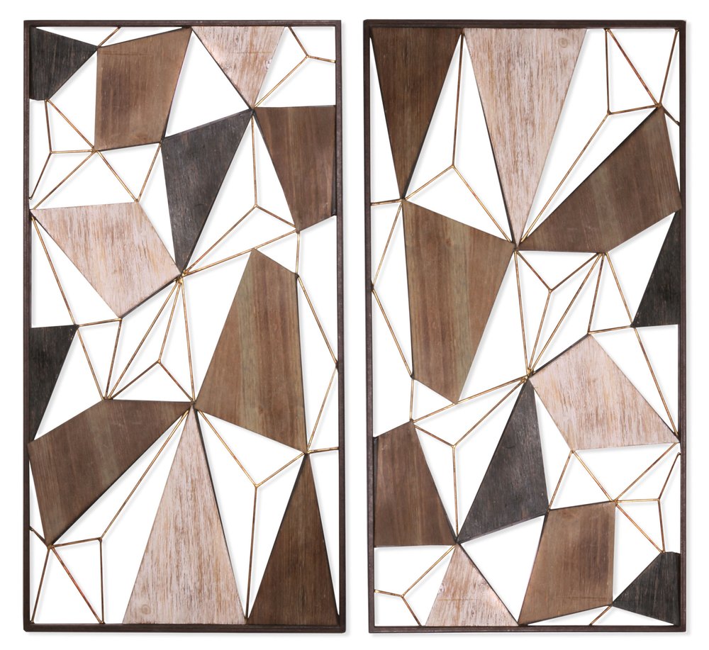 This set of two brown and gold geometric wood and metal hanging dimensional sculptures will add a beautiful decorative accent to your decor. With materials and a finish that is purposefully distressed, this hanging wall decor will instantly liven things up and bring color and dimension to your walls. 38-inch h x 20-inch w x 2-inch d