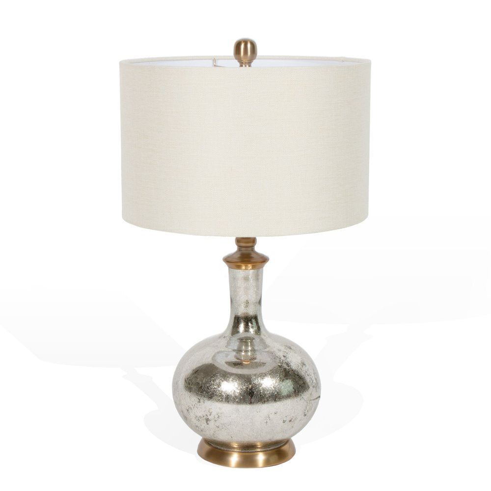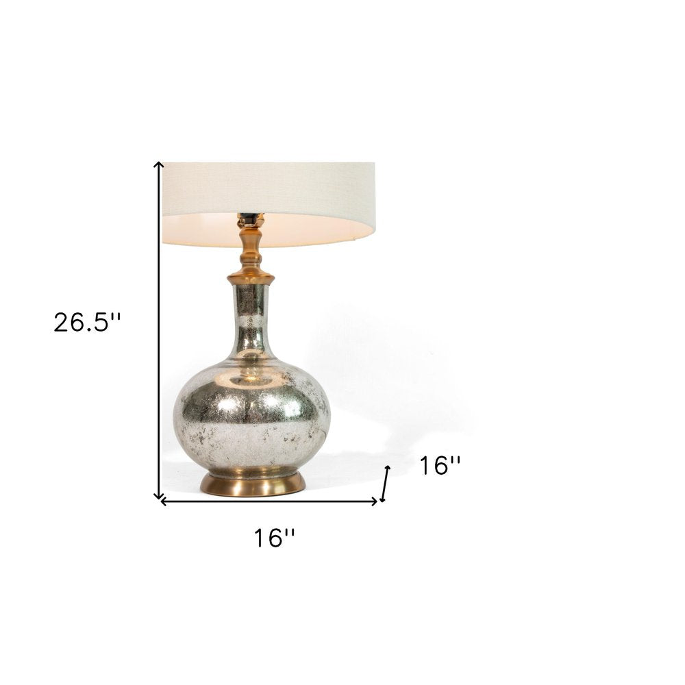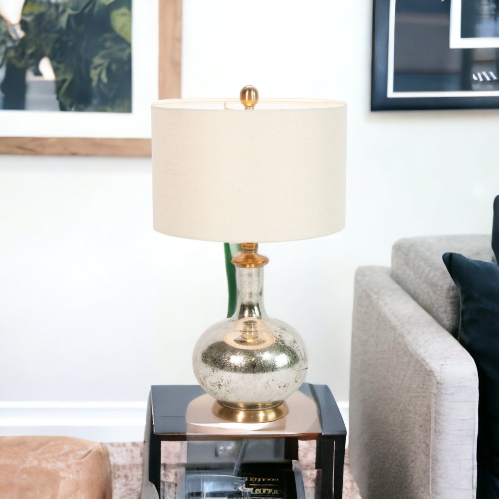 Add a bright anchor to your room with this 27-inch silver metallic glass led table lamp with ivory drum shade. The base of this lamp is made of silver metallic glass. Includes a ivory fabric, drum shaped shade, making this a fashionable piece that will complement most any interior. This standard table lamp is designed to provide general lighting to the area. High quality design makes this a great lamp for not only lighting, but accenting a room with style. Bring some lite and good vibes into your space with this updated and stylishly designed lamp. 26.5-inch H x 16-inch W x 16-inch D
