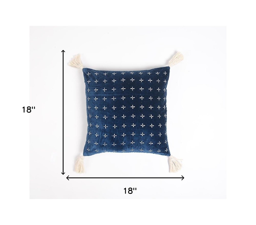 18" X 18" Blue and White Geometric Cotton Pillow Cover With Embroidery and Tassels