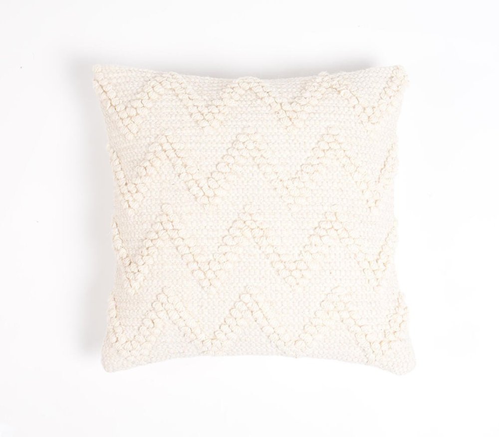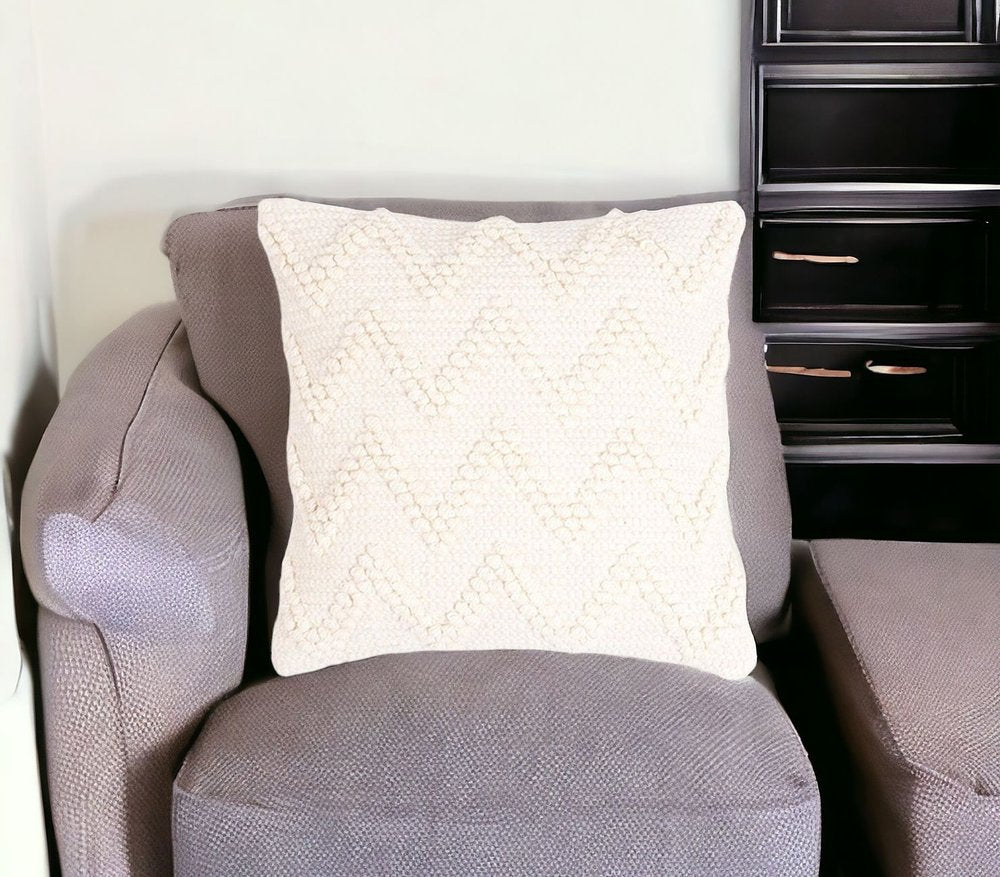 Unique and decorative, this comfortable 18-inch x 18-inch off white chevron cotton blend zippered pillow cover with texture will leave a lasting impression. This soft and durable decorative pillow cover is expertly made of high grade, long lasting cotton blend in a off white coloration. Fun and decorative tufts add some high end and hand-crafted textural designer touches. Decorative throw pillows not only add color and dimension to your space but can be comfy and supportive when you are lounging and cuddling as well. Decorative pillows are a great way to change up the look and feel of your space easily and quickly. 18-inch H x 18-inch W x 0.1-inch D