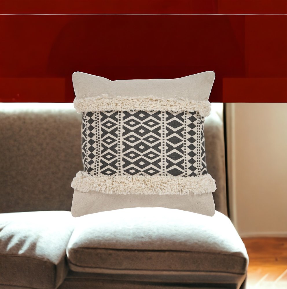 18" X 18" Tan and Black Geometric Cotton Zippered Pillow With Shag