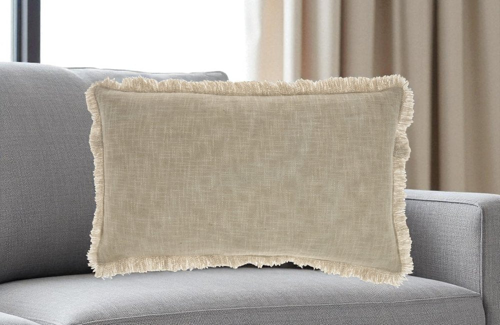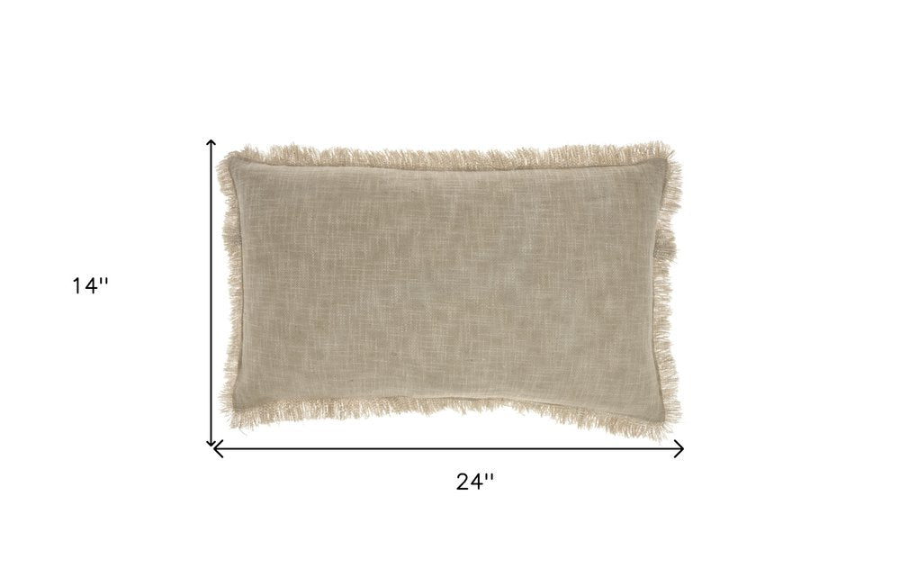 14" X 24" Taupe Cotton Lumbar Throw Pillow with Fringe