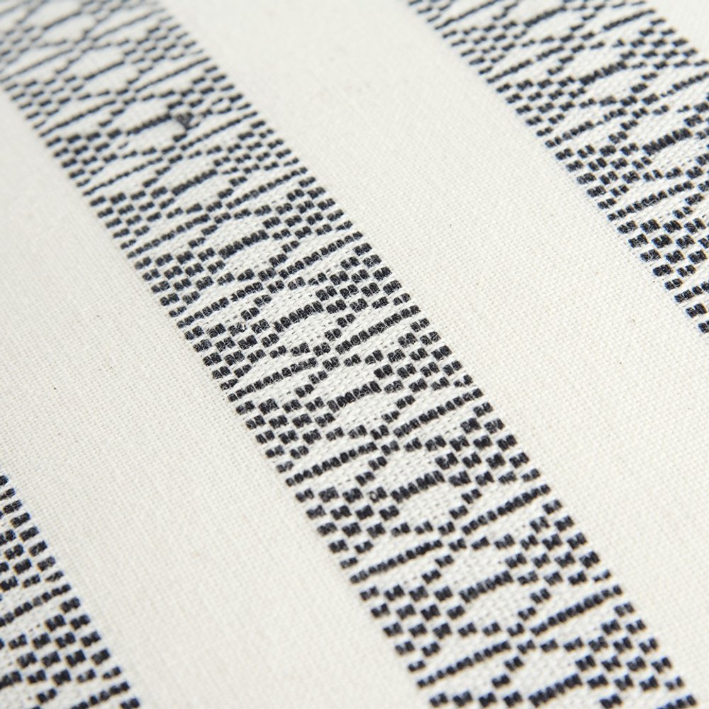 Balancing modern patterns and palettes with a traditional appeal, this Black Ivory Alternate Striped Throw Pillow will upgrade your living room without overwhelming the space. The decorative black stripes on the ivory base create a visual allure while the contrasting mitered flange looks impeccable with the two rows of accent Kantha stitch. Crafted from high-quality cotton fabric with lightly textured surface, the pillow is soft yet durable to last for a long time while the polyfill insert gives the piece a beautiful fluffy look. The solid cotton back features a hidden zipper closure for convenience. If you want a simple yet sophisticated accent piece in your living space, this decorative throw pillow will be the perfect pick to pair with your interior décor. 18” x 18” x 6”
