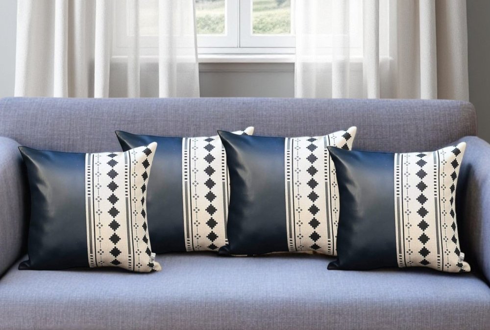 Set of Four 17" Navy Blue Diamond Fabric and Faux Leather Throw Pillows