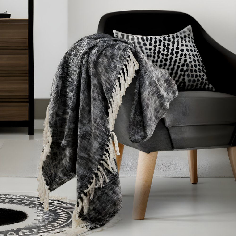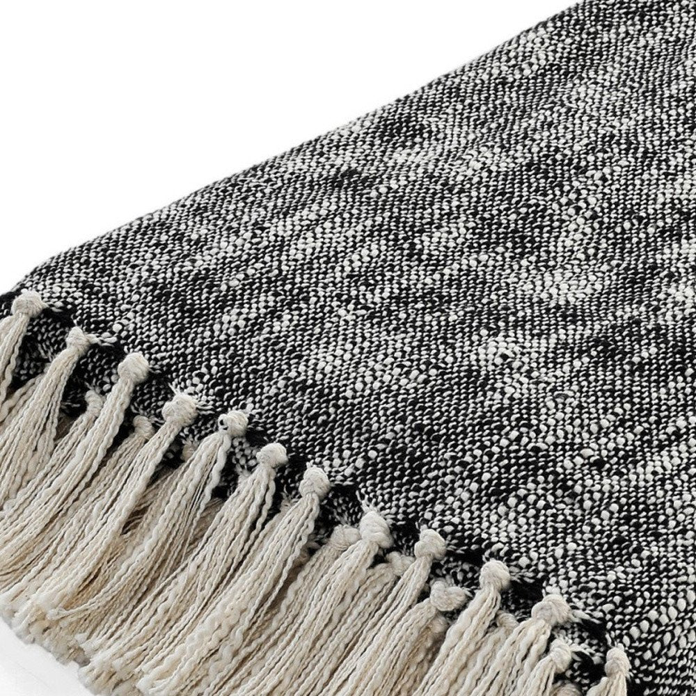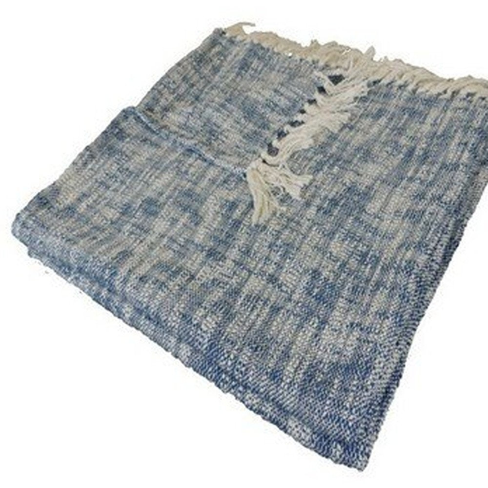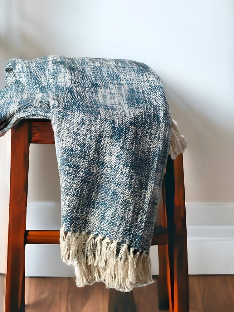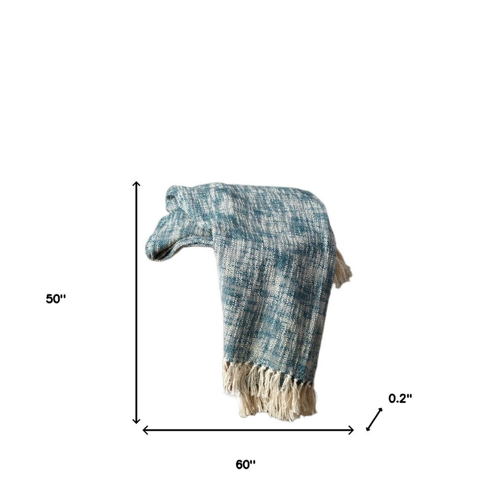 This 50-inch x 60-inch blue and white woven cotton throw blanket with fringe brings a classic, refined style to your space. Features a woven solid color design that offers sumptuous softness and texture that you'll cherish for years to come. Made from cotton this blanket will make a great addition to any room it's added to. Layering your furnishings with a decorative throw has the ability to awaken a tired living room or elevate the design of your bedroom simply by providing elements of color and texture that weren't there before. Perfect for your favorite chair, bed or lounging on the couch, this blanket helps bring a warm and fashionable flair to your space. 60-inch H x 50-inch W x 0.2-inch D