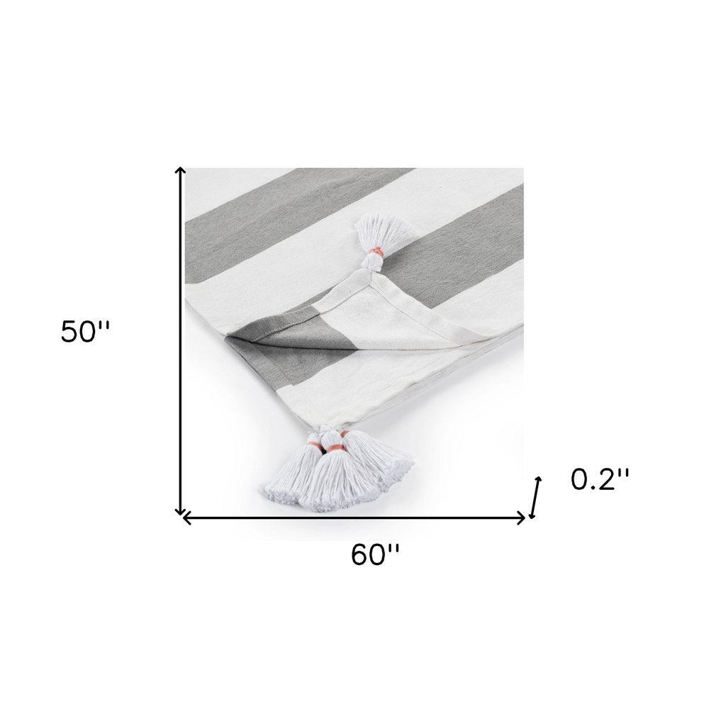 This welcoming 50-inch x 60-inch gray and white woven cotton striped throw blanket with tassels is a must-have for every sofa, chaise, and bed. Features a woven striped design that offers sumptuous softness and texture that you'll cherish for years to come. Made from cotton this blanket will make a great addition to any room it's added to. Layering your furnishings with a decorative throw has the ability to awaken a tired living room or elevate the design of your bedroom simply by providing elements of color and texture that weren't there before. This cozy throw blanket is sure to become your go-to couch companion. 60-inch H x 50-inch W x 0.2-inch D