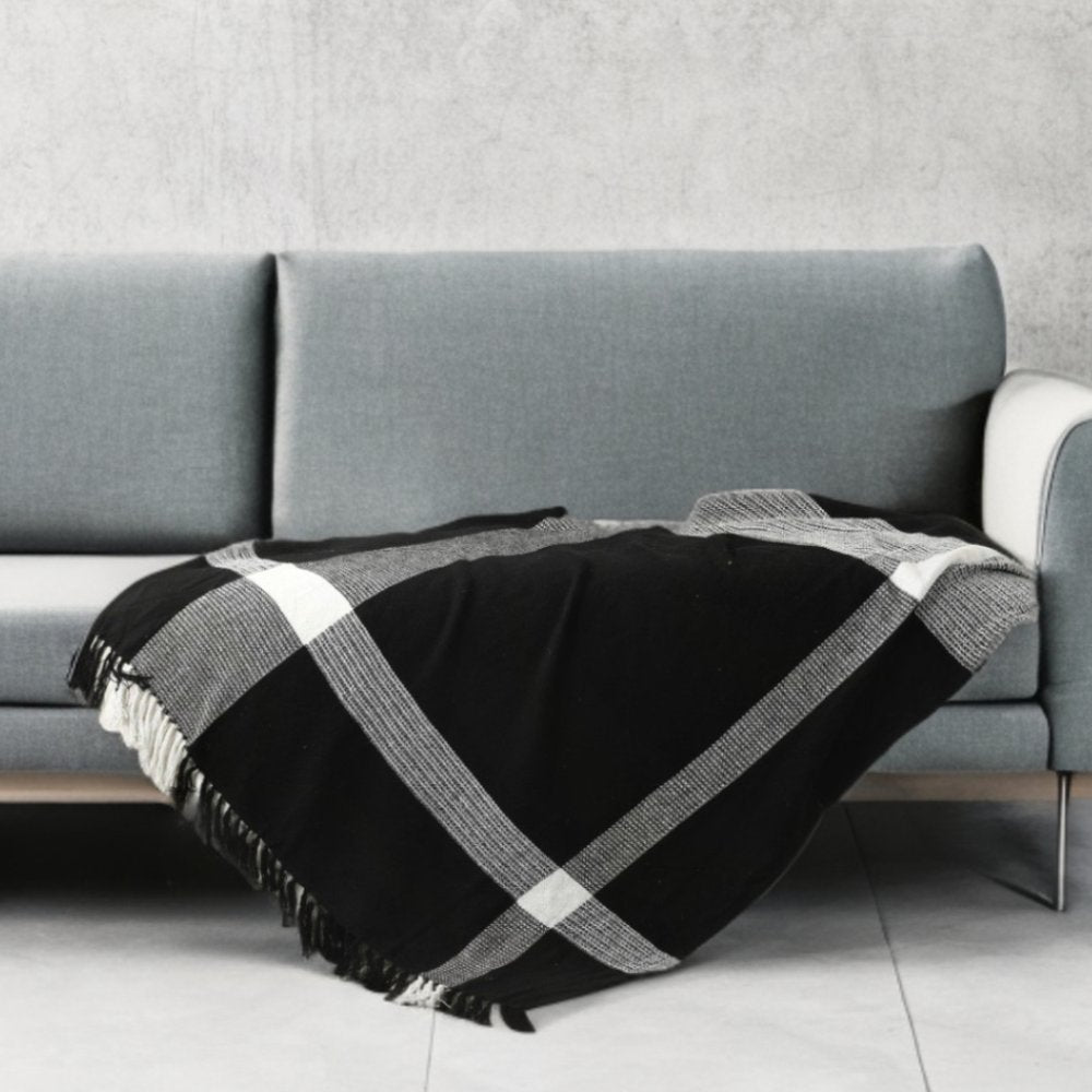 woven cotton checkered throw blanket, cotton checkered throw blanket, white woven cotton checkered throw, blue white woven cotton checkered, checkered throw blanket |
