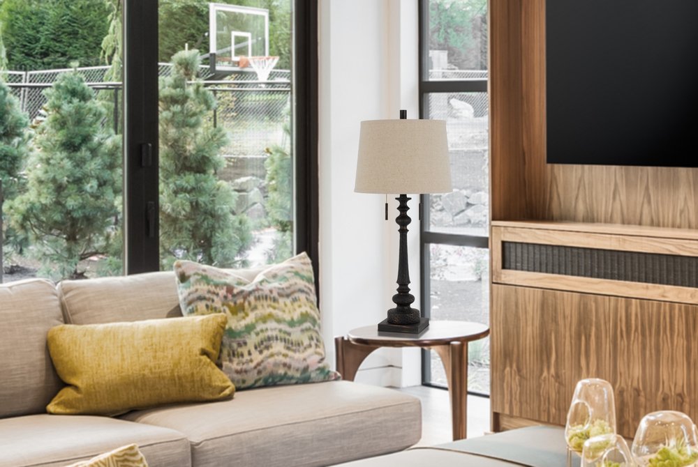 This 32" charcoal two light table lamp with tan drum shade is the perfect combination of design and function. The base of this lamp is made of charcoal resin. Includes a tan linen, drum shaped shade, making this a fashionable piece that will complement most any interior. This standard table lamp is designed to provide general lighting to the area. The light that this lamp throws is soft and warm to elevate the look of most any space in your home. It is perfect for virtually any decor. 31.5" H x 14" W x 14" D