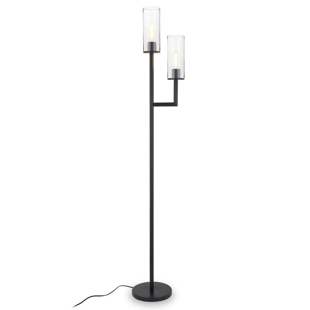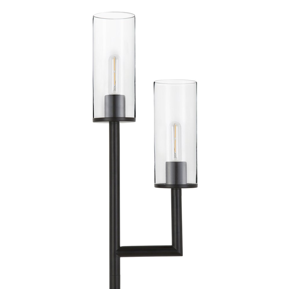With this 69" black two light torchiere floor lamp with clear transparent glass drum shade you bring design along with some warm ambient lighting to your space. A gorgeous black metal base bring just the right amount of pizzazz to this fabulous lamp. The coloration of the black lamp base creates a fashionable marriage with the the clear glass drum shaped shade. Add a soft warm glow to your space with this classic torchiere styled lamp. A straight pole extends upwards from a single base while the scooped shade shape refracts light upward and outward much like it's name sake,a torch. The light that this lamp throws is soft and warm to elevate the look of most any space in your home. The perfect lamp to create just the right natural and soothing light in your space. 69" H x 11" W x 11" D