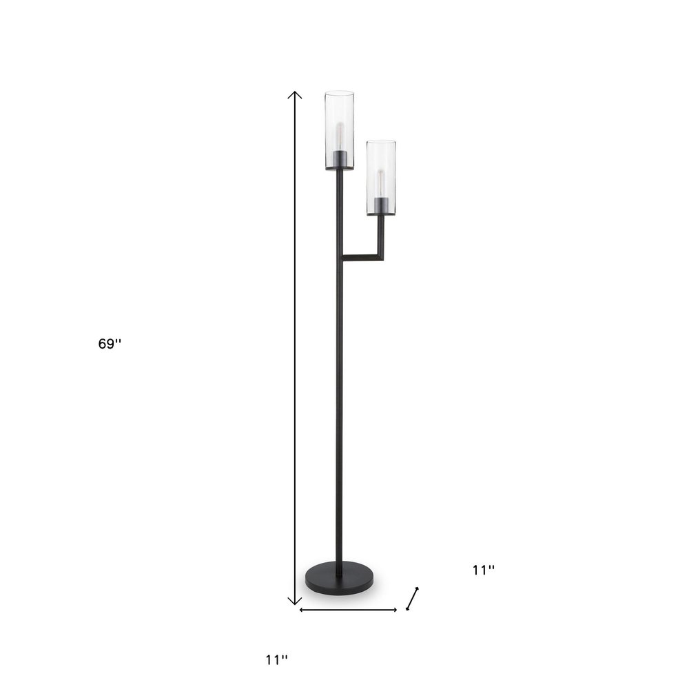 69" Black Two Light Torchiere Floor Lamp With Clear Transparent Glass Drum Shade