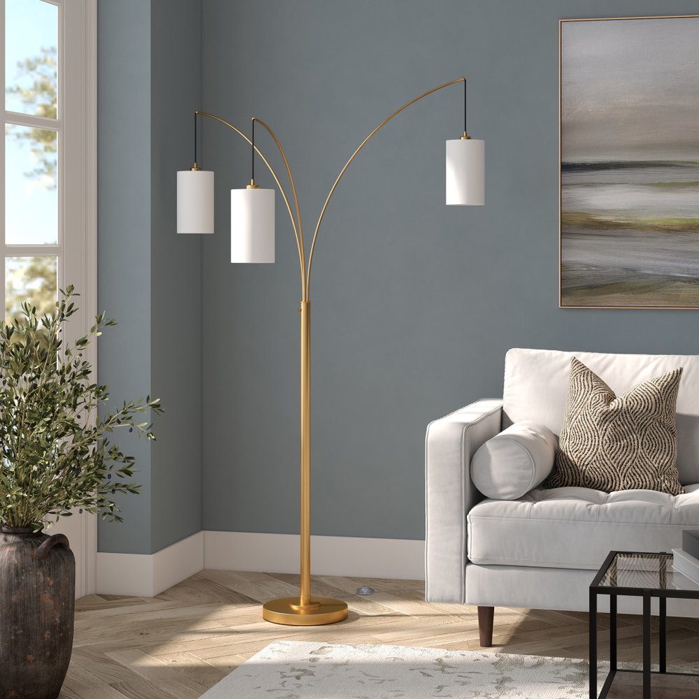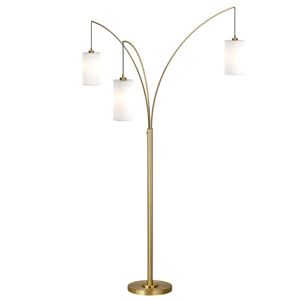 Embrace the good life with this hard working and stylish 83" brass three light tree floor lamp with white frosted glass drum shade. A gorgeous brass metal base bring just the right amount of pizzazz to this fabulous lamp. The brass base coloring infuses a warm and rich tone to your space. The lamp shade itself has a drum shape and is made of fabric, which makes it a perfect choice. Creative and cool, this tree shaped lamp features a straight pole that branches out into multiple arms to maximize the light in your space. The light that this lamp throws is soft and warm to elevate the look of most any space in your home. It is perfect for virtually any decor. 83" H x 19" W x 19" D
